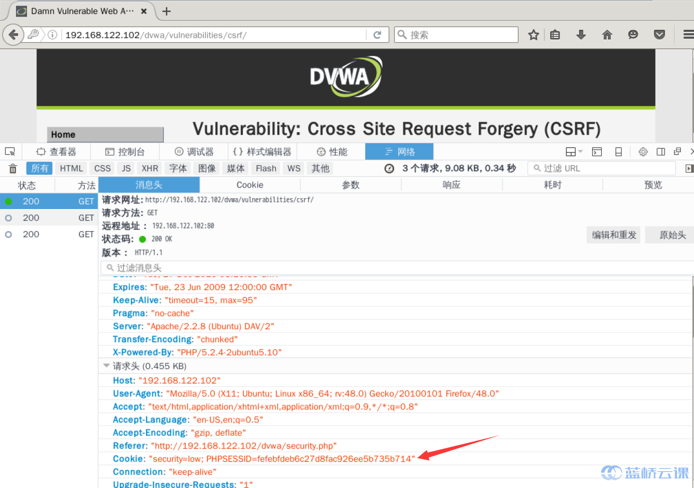 Do not close this page yet. Open a new tab and navigate to the DVWA page again (for example, accessing 192.168.122.102/dvwa). You will observe that logging in again isn’t required, which is due to the presence of cookies. But what happens if someone accesses this URL?