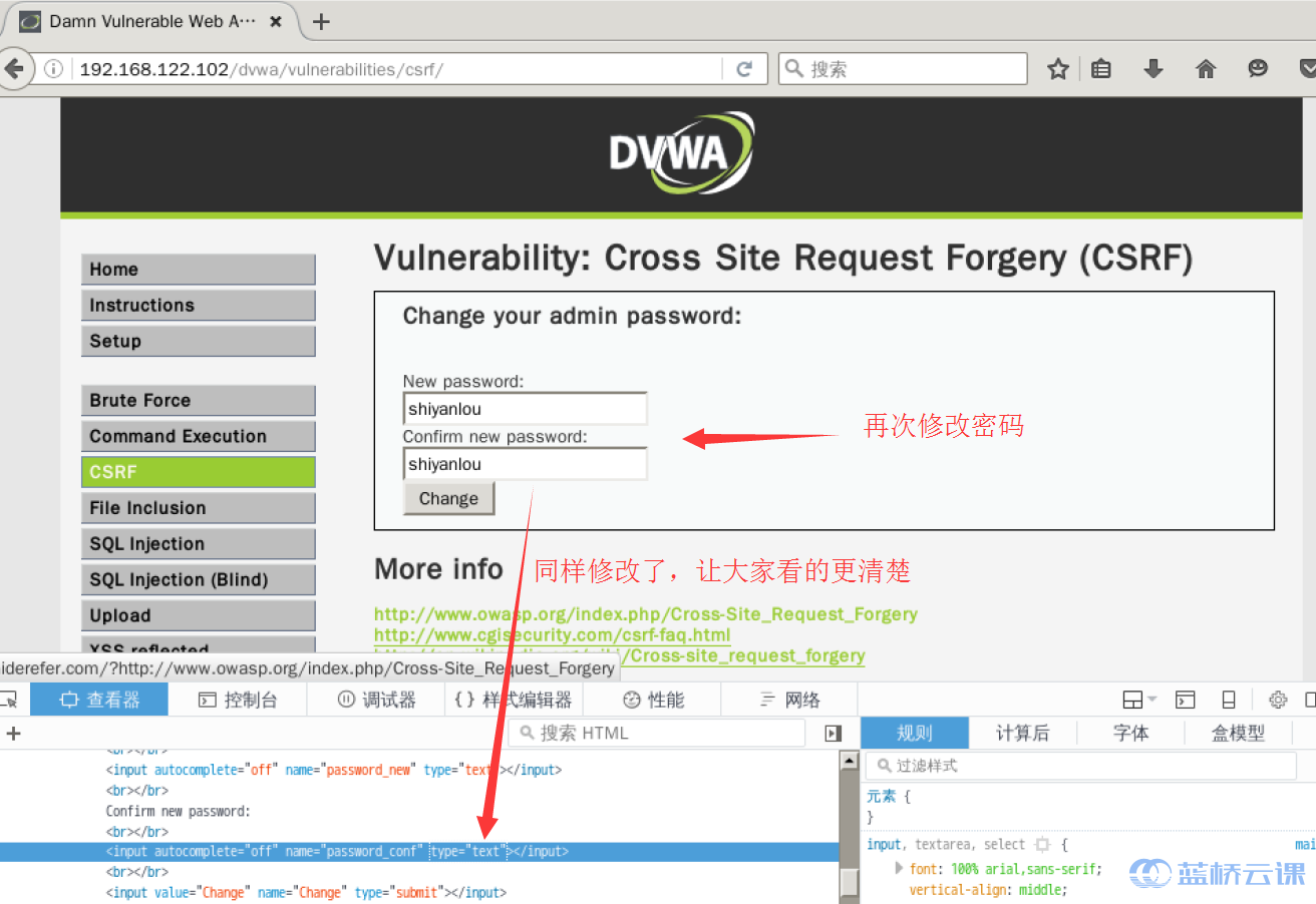 This demonstrates that medium-level security measures are insufficient. When the security level is increased to “High,” the CSRF page changes, requiring three parameters for password modification: the new password, its confirmation, and the current password. Without knowing the current password, an attacker cannot silently change it.
