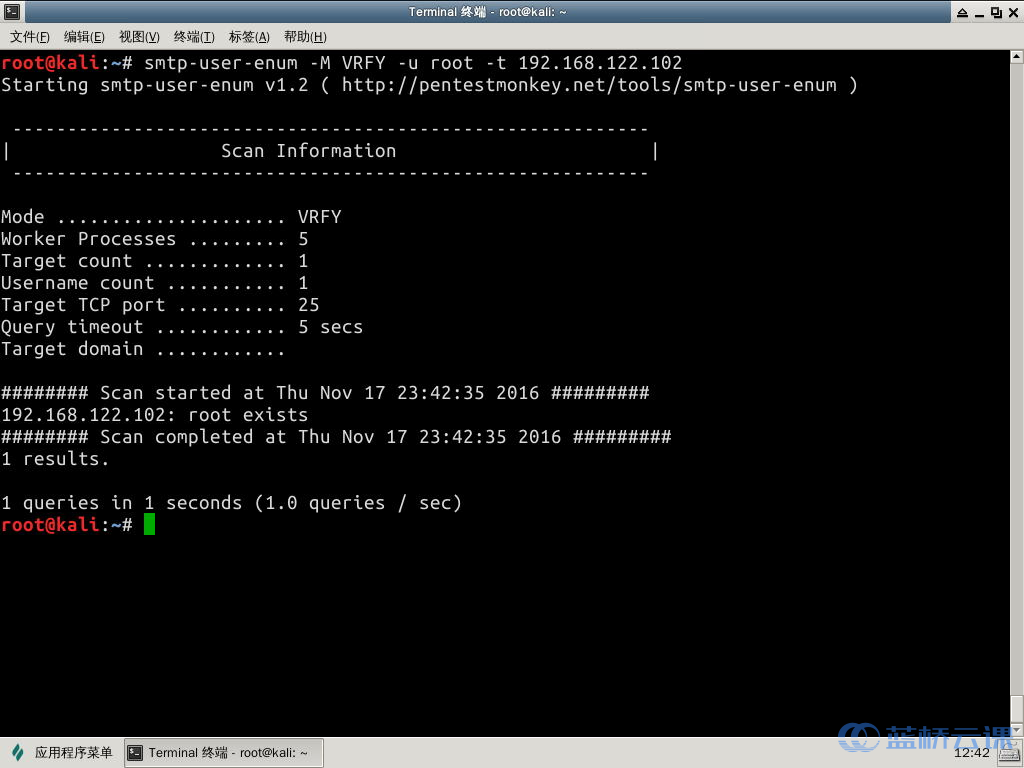 smtp-user-enum -M VRFY -u root -t <target IP>In the Kali terminal provided by Shiyanlou, enter the command to enumerate SMTP users: