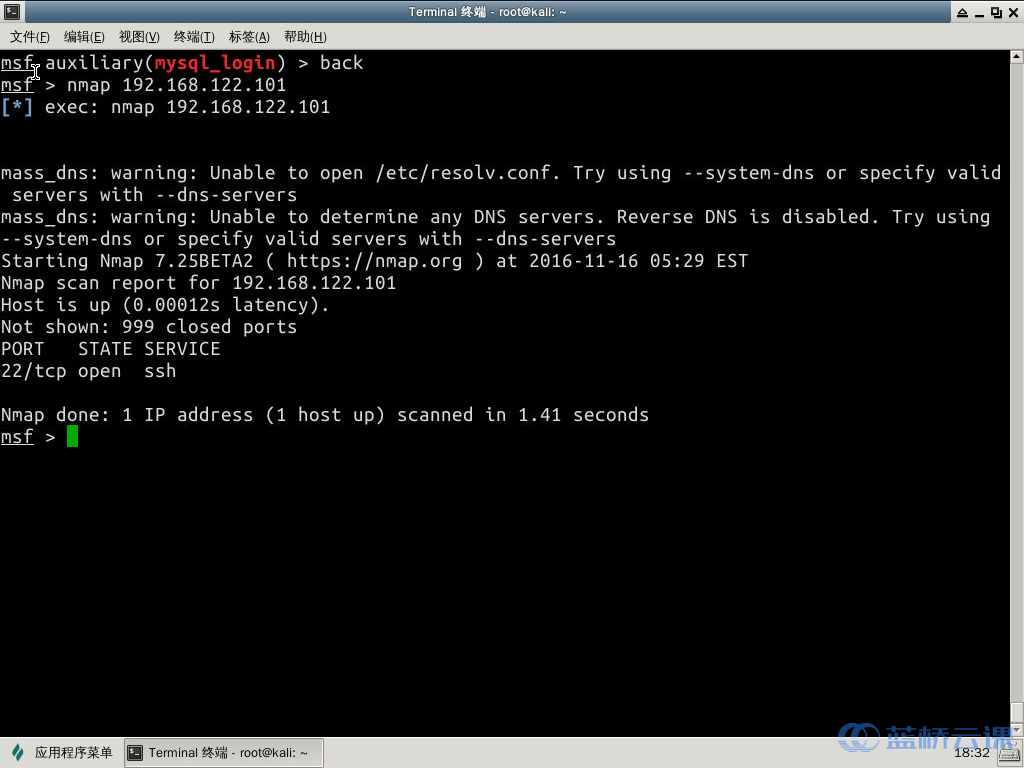 The Metasploit Framework integrates the Nmap component. Before launching an attack on the target system, it is usually necessary to gather basic information, such as identifying active hosts in the network and discovering open ports on those hosts.
