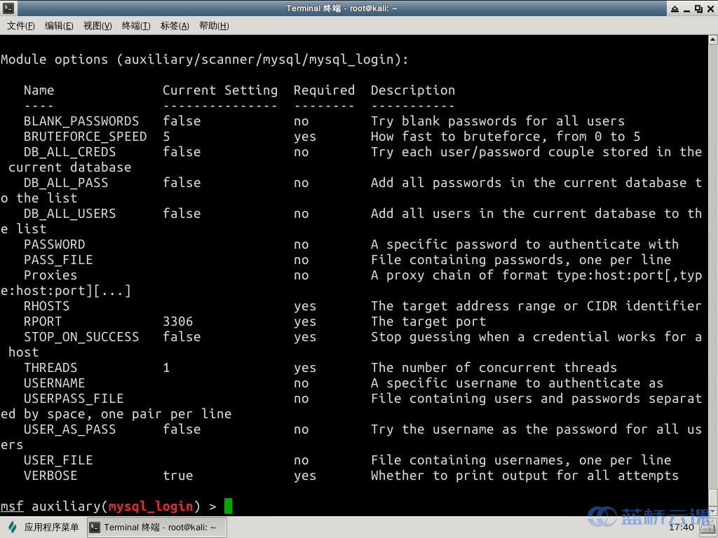 Metasploit tries all username and password combinations contained in two files. Once successful, it produces a username-password pair. The principle involves exploiting a MySQL vulnerability on the target machine. After selecting the MySQL login exploit module, we configure the options and execute the exploit, allowing us to brute-force MySQL credentials. During this process, Metasploit uses username and password files provided to attempt logins. Collecting accounts and passwords relies on consistent data-gathering efforts, such as phishing websites used to trick users into registering. This is the same idea.