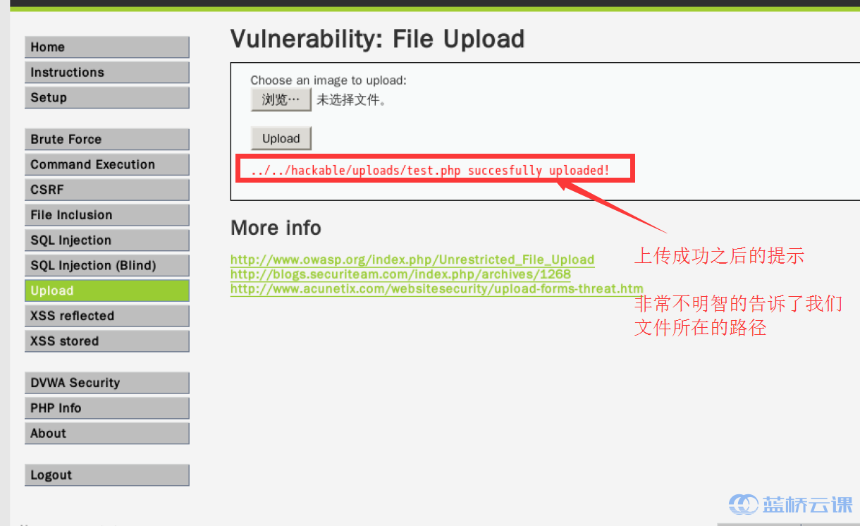 The success message provides the file path of the uploaded file. Such messages are unwise as they make inclusion attacks much easier.