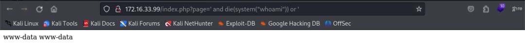 After trying various bypass methods and payloads from HackTricks[2], a situation similar to the target machine was found in the assertion. Using the payload ' and die(system("whoami")) or ' successfully executed a command, revealing a remote code execution vulnerability.