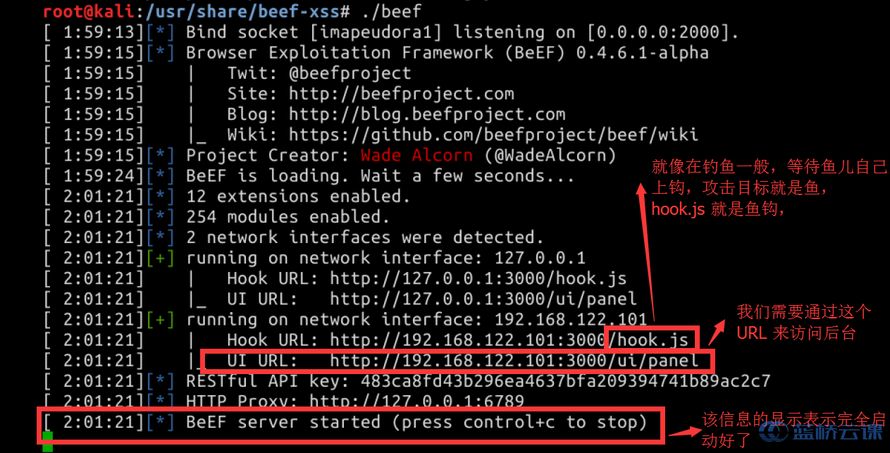 Then, we will see information about the program startup appearing in the terminal interface. Starting BeEF can be a bit slow, so patience is needed. When this line of information appears, BeEF has fully started, and we can access the admin page through the browser.