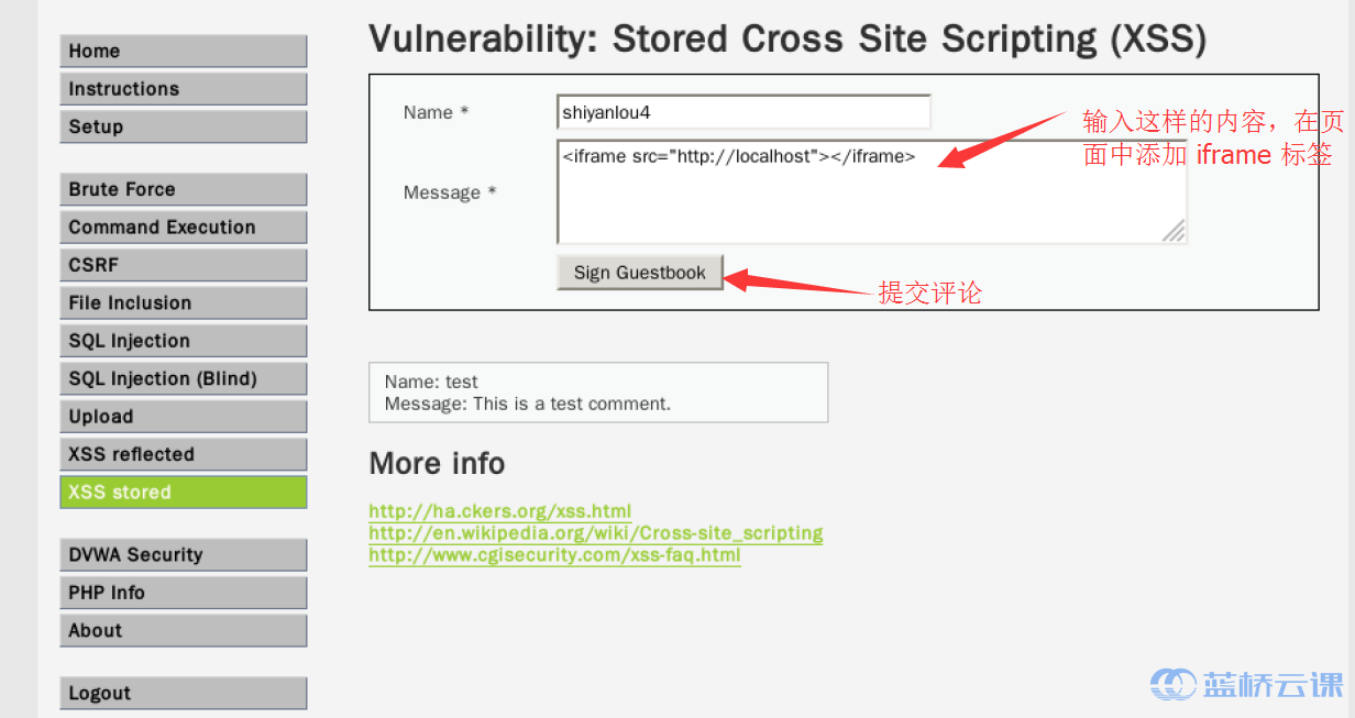By navigating to the `XSS stored` section in the application, the DVWA interface presents a platform designed for experimenting with these attacks: