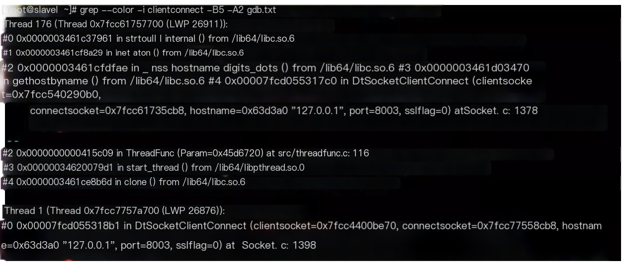 4. Programs randomly crash through analysis of the core dump file with gdb, locating the issue to the use of ‘gethostbyname’ under concurrency conditions, and a temporary fix was adopted.