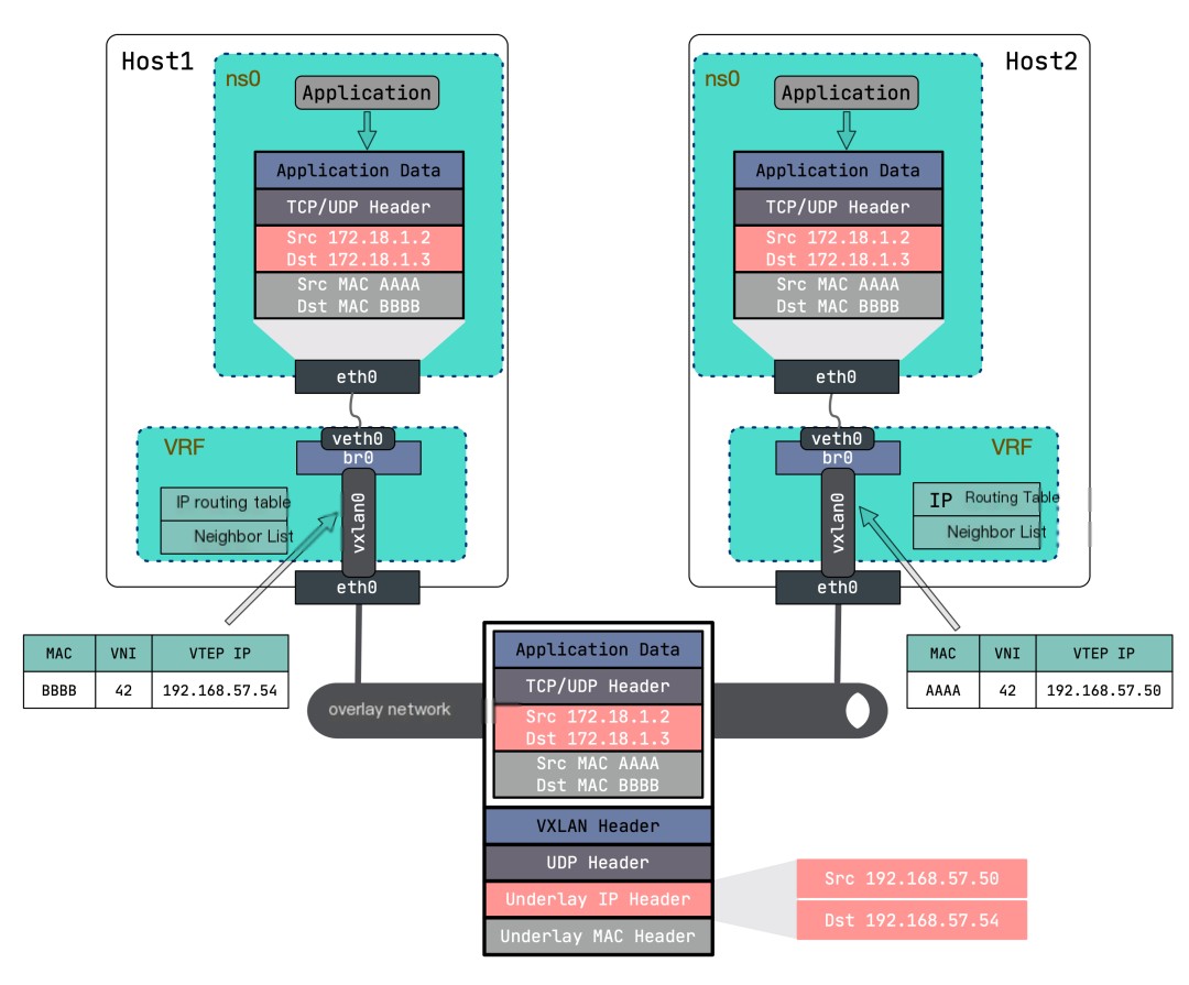 172.18.1.3, check the routing table, and send the packet viavxlan0. - The kernel recognizes that