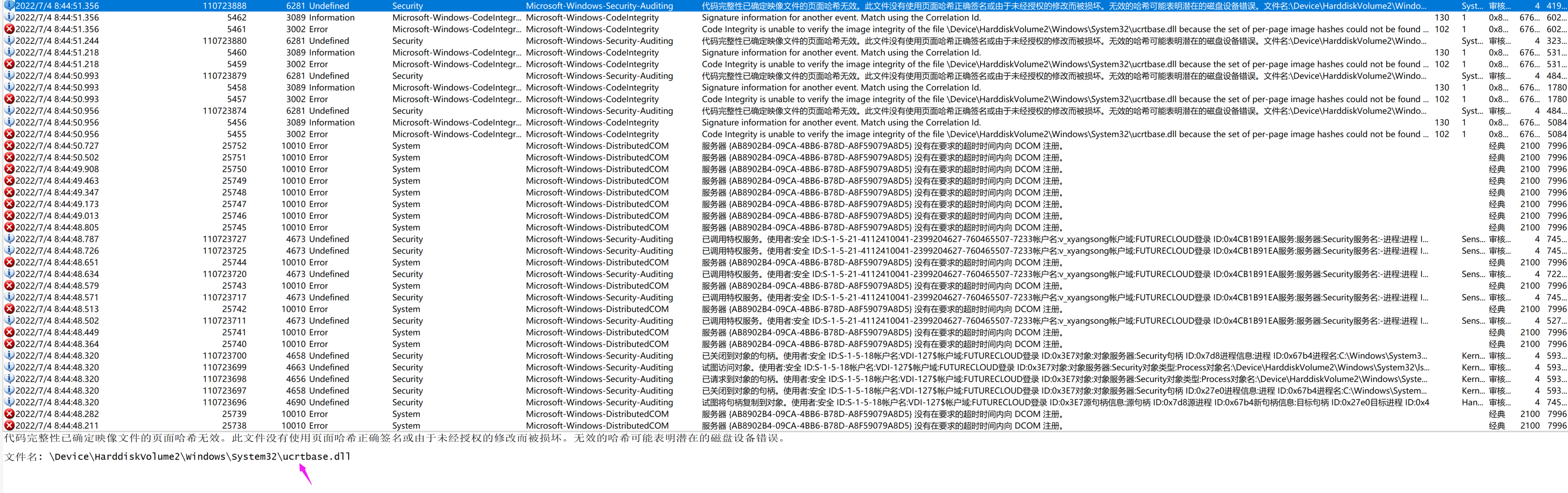 From the logs, it appears that C:\Windows\System32\ucrtbase.dll is corrupted. After replacing this file from a functioning system, the system booted successfully, but other issues were still identified. Analyzing the logs suggests that the problem might have occurred during the update process, with multiple files being corrupted. Therefore, it was decided to back up business data and reinstall the system.