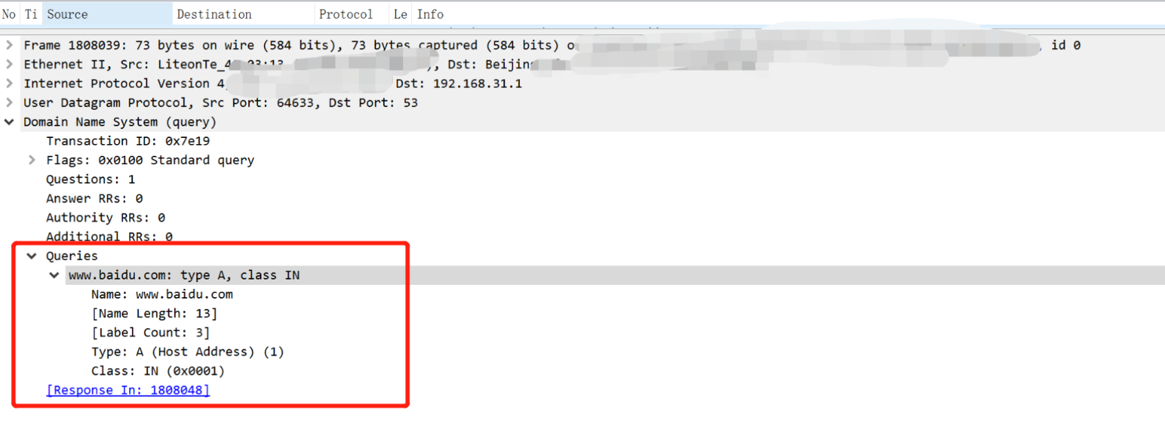 Based on the above, we can specifically analyze through the detailed information column of the selected packet in Wireshark to see what query information the client sends during the DNS resolution process of www.baidu.com.