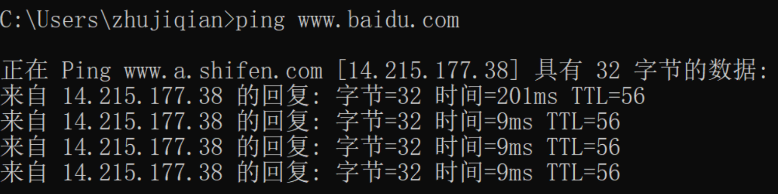 By using the packet capture software Wireshark, you can verify this. Still using the domain name www.baidu.com for the experiment, let’s first see what its corresponding IP address is by pinging it directly in a command window. The IPv4 address is 14.215.177.38