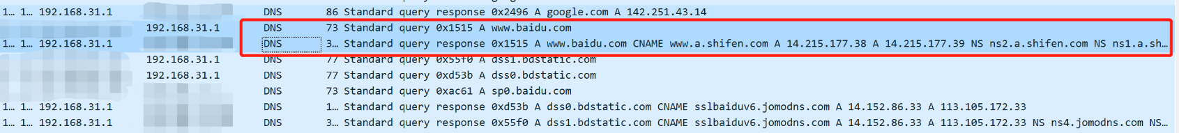 It can be seen that the DNS query information’s domain name is www.baidu.com, class is IN, and type is A, which indicates that it maps to an IP address.