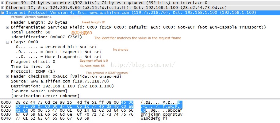 Flags: Used to identify whether a packet is part of a set of fragmented packets. The lowest bit is MF (More Fragments). When MF=1, it indicates there are “more fragments” in the packet. MF=0 indicates it is the last fragment, and the middle bit DF (Don’t Fragment) prevents fragmentation, allowing it only when DF=0.