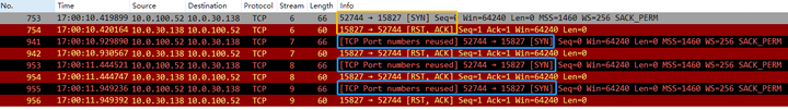 This scenario involves rapid SYN RST events. TCP Stream 6 initiates a TCP three-way handshake but is RST rejected by the server. After a 500ms interval, the client attempts a new connection with the same TCP source port 52744, which again is RST rejected by the server. In this case, repeated SYNs will be marked as [TCP Port numbers reused], indicating that the same connection is being attempted repeatedly.
